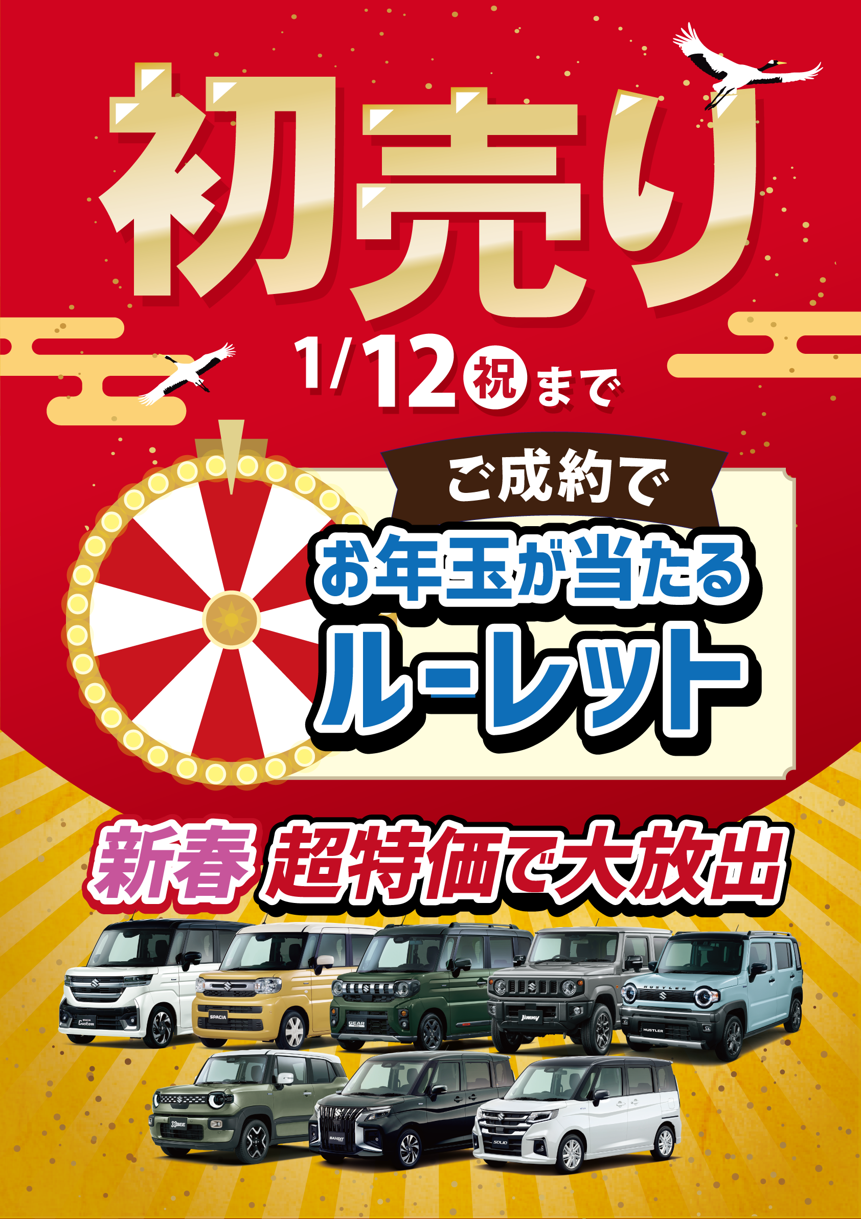 1/4(日)より初売り \ 1/4 より 初売りスタート / ★ ★ ご成約特典 ★ ★ お年玉が当たるルーレットで運試し さ ら に 新春 超特価でお買い得 ぜひぜひこの初売り期間に ご来店をお待ちしております ♪