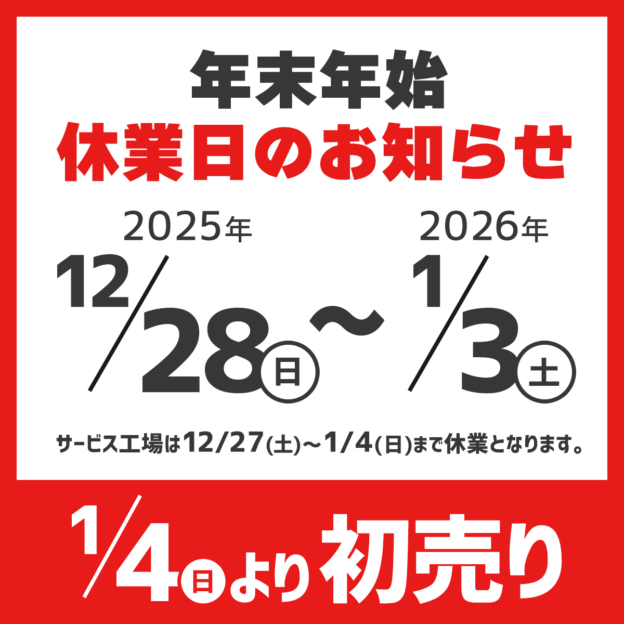 日頃はスズキアリーナ大阪西をご愛顧賜りありがとうございます。 誠に勝手ながら当社は下記の期間中、休業致します。 ショールーム:2025年12月28日(日)~2026年1月3日(土) サービス工場:2025年 […]