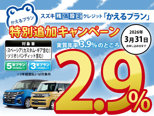 スズキ残価設定クレジット「かえるプラン」特別キャンペーン スペーシア・ソリオも2.9%